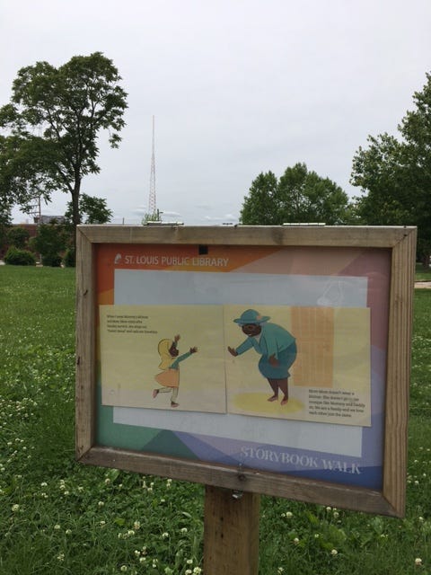 Much like the Commonwealth Avenue Mall in Boston, the southern segment of the St. Vincent Greenway is basically a long straight-shot of a green path through residential homes and buildings with Forest Park waiting at the end. The path winnowed south past robust trees and sculptures by local artists. One featured that I was especially fond of was the St. Louis Public Library’s “Storybook Walk” exhibit, where display cases on posts showcase the pages of a storybook that you can read as you walk along the greenway. (This week’s featured book was Mommy’s Khimar, by Jamilah Thompkins-Bigelow and Ebony Glenn.) I was also enamored with the leafy alleyways that the path would regularly cross. I would have gladly taken a detour and ventured down one of those alleyways if my fear of toothy territorial pets hadn’t stopped me.