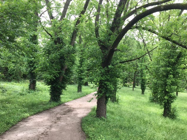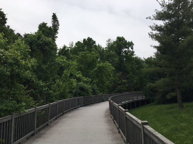 The paved path of the St. Vincent Greenway snaked through some impressive woods on the side of the busy roadway before veering south and burrowing right into through university campus, which felt like an abandoned city with graduation having passed. I ambled past football fields, lots of shade trees, duck ponds, and at one point, a pair of Canada geese that hissed at me as I noticed their goslings. All the while, the sky continued to glower and occasionally rumbled with thunder and a flare of lightning.