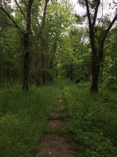 The following morning, I returned to the bus stop shelter and picked up the St. Vincent Greenway again, following it to the southern edge of the UMSL campus and into the meadows and forests of St. Vincent Park—the grounds of a former Catholic hospital that went the way of the dinosaurs in the 1980s. Some of the neat features of the park are the traces of history that remain here, like forgotten sidewalks that disappear into the resurgent forest, or the Daughters of Charity cemetery whose closed entry gates are spaced wide enough to allow the passing hiker to slip inside and walk among the headstones. As the woods became more immense, the trail descended into them by way of weaving switchbacks and the immensity of the green colors here stunned me. It spoke to what a wealth of natural green space St. Louis is tapping into once again.