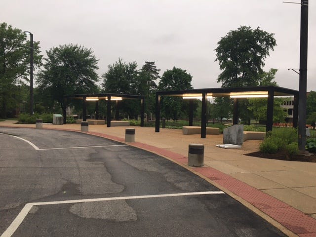 I was getting nervous. My coffee shop plan hadn’t accounted for the fact that UMSL campus would be more or less shut down. As the sky became darker and the timing between lightning flashes and thunder narrowed, I decided to seek shelter. A pair of lighted bus stops seemed like an appropriate place to ride out the first storm, which drenched the area with crashing rain and lightning so frequent that it brought to mind Berlin’s dirtiest clubs. I waited in the bus shelter for over an hour but the storm was relentless. Every window between downpours lasted only a few minutes and once it became clear that the deluge was going to last all day , I realized I would have to bail on the hike and pick it up the next day, before the wedding. As the lightning finally began to wane, I sprinted half a mile through rain to the closest Metro train stop, on the south end of campus, and planned to return here once the thunderstorms passed. Even an urban hike can be upended by inconvenient weather. But jumping on the bus or train is highly preferable to scrambling down an exposed ridge toward the treeline.
