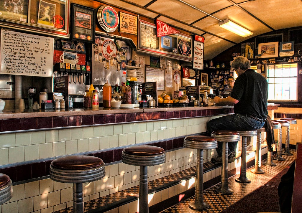 Or—more specifically—because we could use more Third Spaces; venues that are not home (the first space) or a workplace (the second space) where we can be with other people, for free or next to free. This may sound wonky or academic at first, but most of us have cultivated a few third spaces in our lives. That dive bar that still offers $5 PBRs and always puts on The Cure’s Disintegration after 9pm? Third Space. The loop path around the closest pond where you meet up with a friend to stroll, run, and/or people watch? Third Space. A plaza where people are shooting the breeze, tucking into sandwiches, and shooting “fuck around and find out” glares at pigeons? Third Space. These are a few examples of the Third Spaces one can find in America these days. But…did you notice the key difference about that first example? The dive bar?