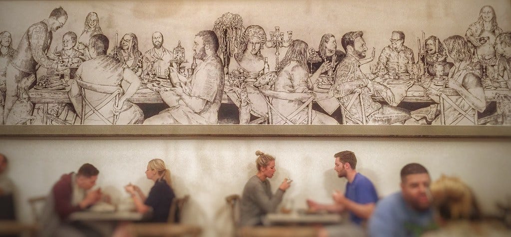 All of this has been on my mind for the last few days. Not just because it’s colder and tougher to spend prolonged time outside, but because I just learned that one of the largest indoor Third Spaces in Boston—the Time Out Market food hall located near Fenway Park—is closing its doors at the end of the month. This was a crushing bit of news to absorb, because for all its shortcomings, this huge cafeteria-esque joint was one of the only reliable indoor venues in Boston for meeting up with friends without having to spend more than a couple bucks each on food or drinks. You could order an entire barbecue platter or a trilogy of overpriced cocktails if so inclined, but getting a single egg roll or even a small coffee was also acceptable. Hell, I sometimes met up at the marketplace with folks and didn’t a spend a dime. You could do that too! Because at the end of the day, Time Out Market was as much a gathering space as a business.