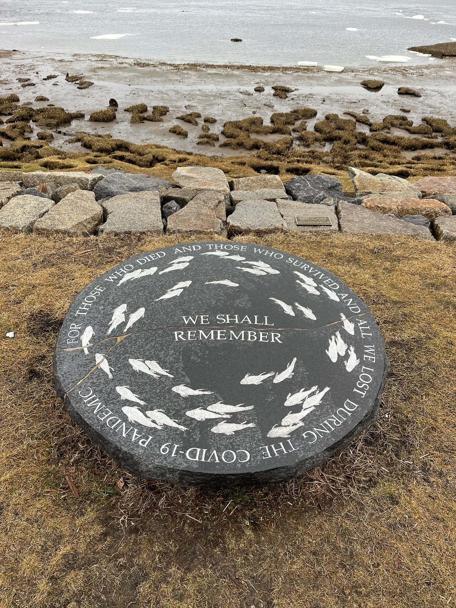 At first, all I saw was a wheel of dark granite, on which a school of white fish appeared to be swiming in circles. And then, I read the words. “For those who died and those who survived and all we lost during the COVID-19 pandemic. We shall remember.”