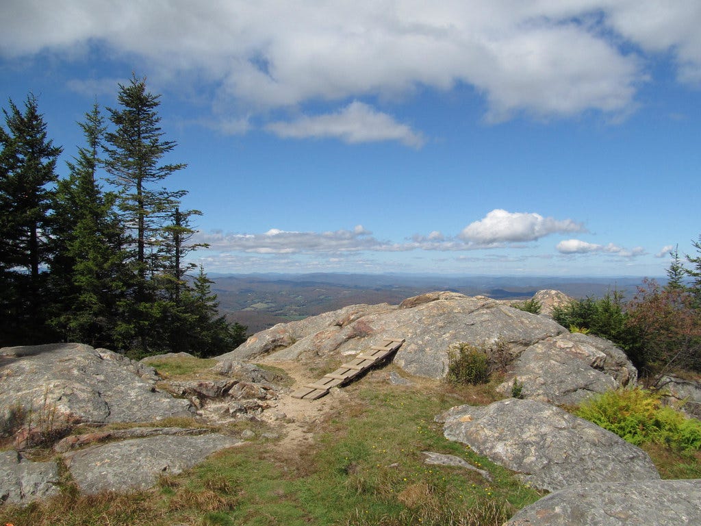 I love this idea of a natural landmark imbuing the people nearby with a special energy; real or perceived! New York Mayor Eric Adams talked about this in 2022, arguing that the city derives its special vibe from a big deposit of gemstones that are buried deep in the bedrock beneath Manhattan. (In my opinion, this says more about Eric Adams than New York.) These days, Mount Ascutney might not be the shit-hot landmark for creatives as it once was, but the peak still inspires and attracts noteworthy visitors. The granite outcroppings on the mountain’s haunches have become a popular “jump zone” for hang-gliders. And it was the possibility of watching hang-gliders taking that stomach plunging leap of faith into the abyss that inspired me to finally go for a hike on Ascutney two summers ago. My introduction to the mountain had happened earlier that year, on a media visit to the Saint-Gaudens National Historic Site. I was no longer content to simply gawk at Mount Ascutney. I wanted to feel the mountain in my soles and under my fingernails. I wanted to be inspired by the mountain and humbled by it.