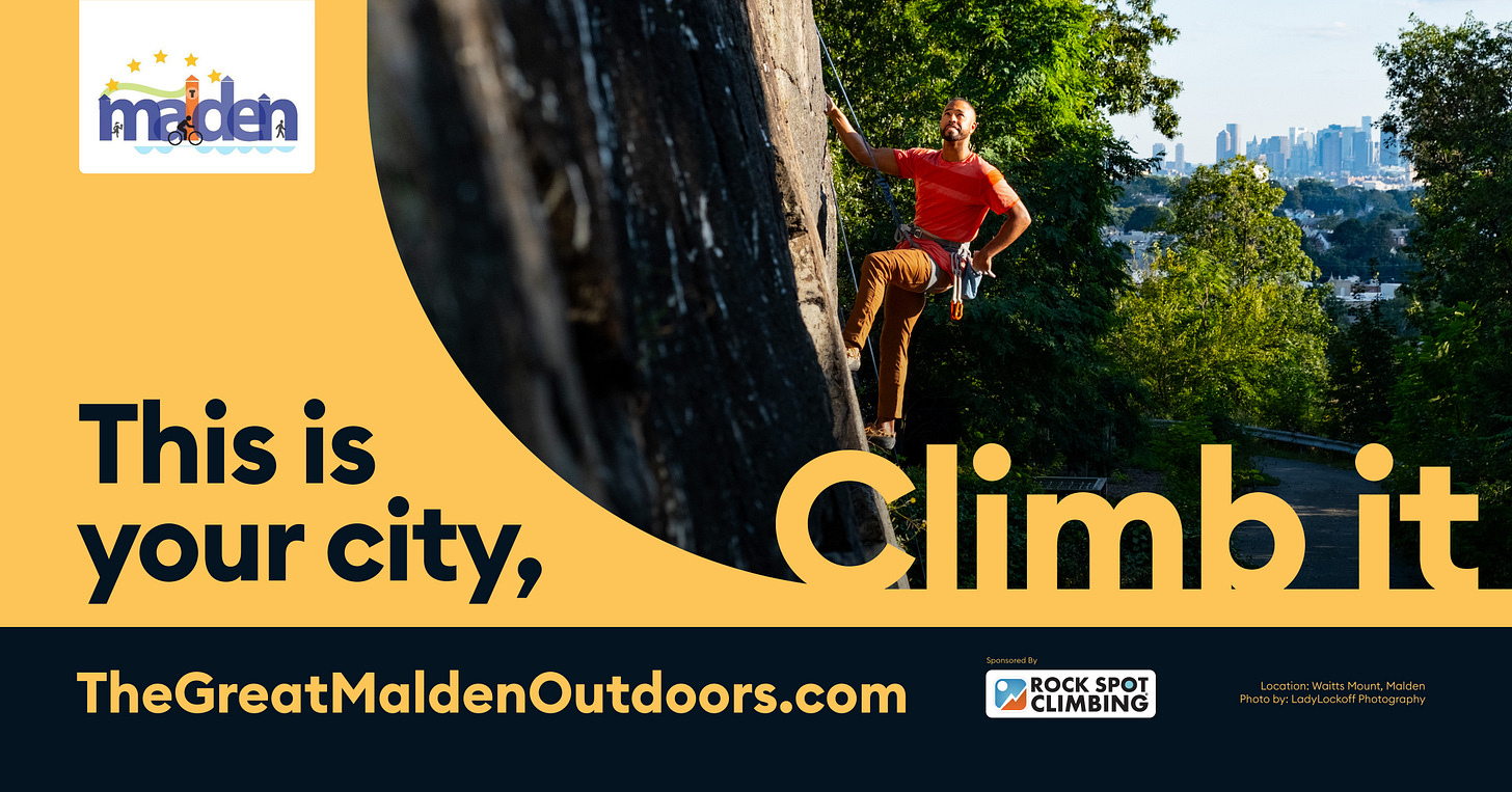 The Great Malden Outdoors was really designed to be adopted by the city. I’d like to be a bit of a Johnny Appleseed and bring this to all 26 gateway cities in Massachusetts, but also to other states and regions of the country. I’ve seen a lot of other states look to outdoor recreation as one of their primary drivers for growth in economic opportunities, because it doesn’t cost a ton of money to begin with. We’re not talking about building new roads or bridges or stadiums. Even when skating became popular in the 90s, you still had to convince the city to find a space and then build a skate park. We don’t have to do that. We already have the rivers, the ponds, the rocks and the common crags. One of the core messages of the program and recent ad campaigns such as “This is your city, Climb it / Hike it / Bike it” is that these public spaces belong to the public, by right. So let’s use outdoor recreation to promote and share them!